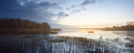 Summer landscape with lake in the field with blue sky. Sunset orange sun on the horizon.