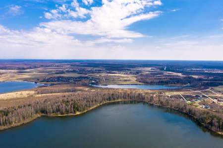 View from the drone of the Uvodsky reservoir on a spring day, Ivanovo Region, Russia.