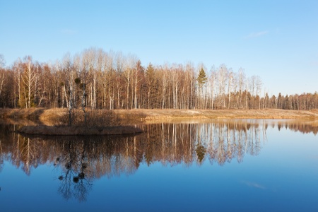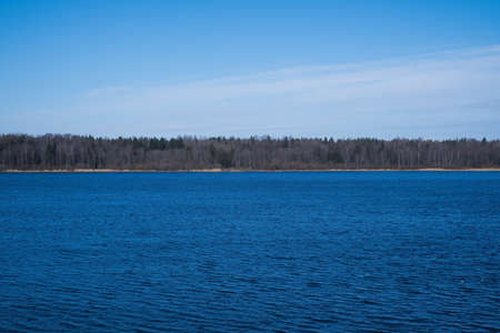Spring landscape with forests, as reflected in the blue water of the Lake