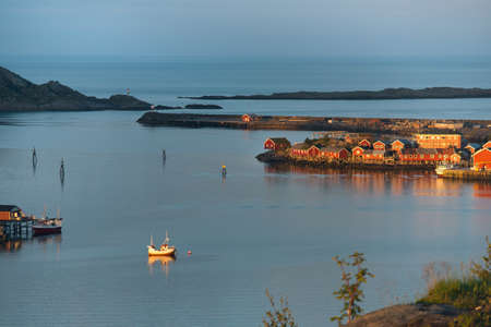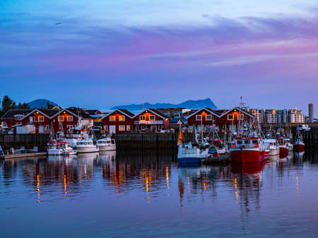 Moloen, Bodo, Norway - August 18, 2019: View of the marina. fishing boats and typical wooden nordic houses with reflection in the water after sunset Nordland. Europe. Gate to Lofoten