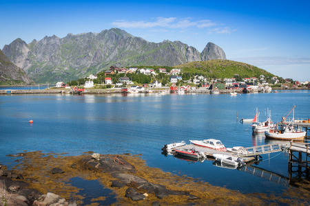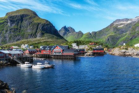 Scenic view of Reine village in sunny day. Rorbu, Lofotens, Norway landscape