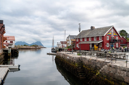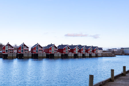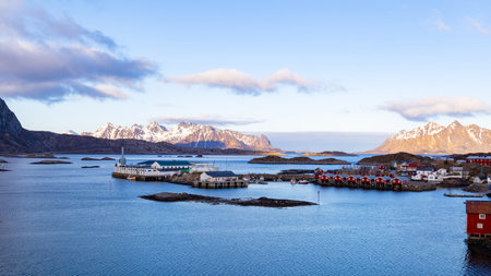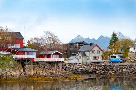 Scenic coastal view with red houses and calm water. Lofoten islands, Norway