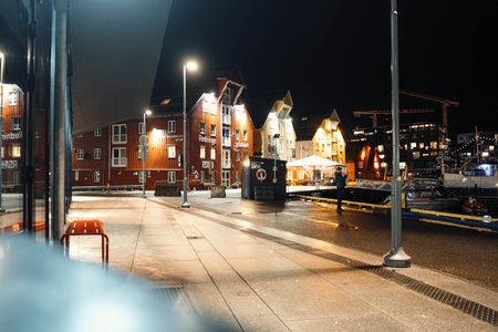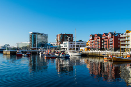 Tromso harbour, Norway, March 3rd 2022: Pier and traditional and new modern buildings in marina