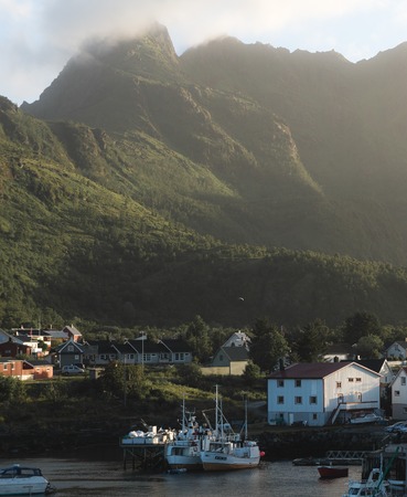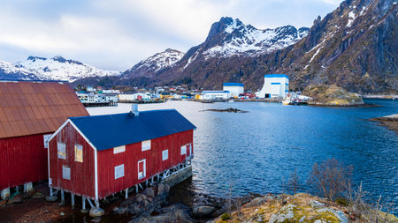 Beautiful Sorvagen village in nothern Norway, southwest Lofoten, village with typical wooden red cabins, called rorbuer