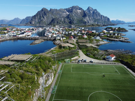 Aerial view of fishing village and football field on Lofoten Islands in Norway