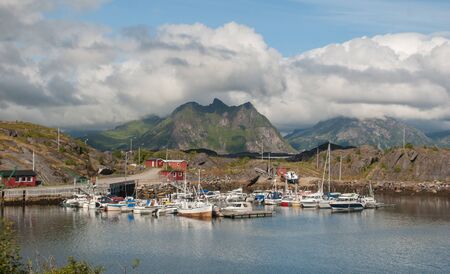 Boats and yachts in a bay on a background of mountains, Lofoten archipelago, Norway. National Tourist Route Lofoten