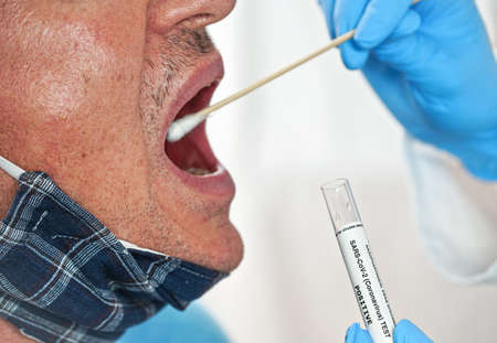 Stick with cotton swab to be inserted into elderly patient open mouth, tube for virus specimen transport held by hand in blue glove near, closeup detail. Coronavirus covid-19 test concept