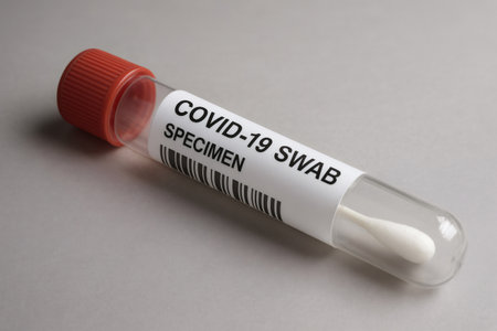 Sterile medical swab sample collection tube containing covid 19 specimen, lying on gray background