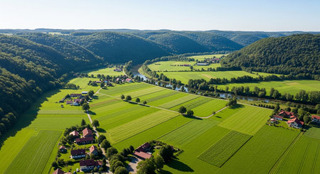 An expansive aerial view captures a winding river through a vibrant green valley dotted with farms and small houses under a clear sky.