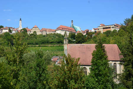 Rothenburg ob der Tauber, old famous city from medieval times seen from the romantic valley of the river Tauber