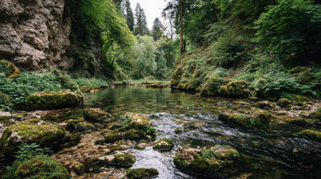 Discover the beauty of a peaceful river winding through a lush forest, surrounded by mossy rocks and vibrant greenery, perfect for nature lovers and photographers.