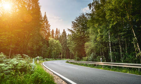 the road in the summer or spring forest. Concept and idea of travel by car and vacation