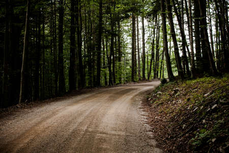 Photo of landscape - Road going through the green forest. Old and dirty road (way) with bad asphalt in the mountains - illuminated (natural light). Fresh greenery in nature after rain.