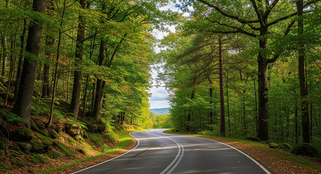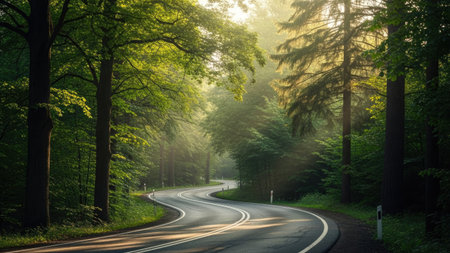 A winding asphalt road curves through a dense forest with tall trees. The scene is bathed in sunlight, creating a bright and airy atmosphere. The composition features vibrant green foliage and a sense of depth. This image can be suitable for various commercial purposes, including travel or environmental projects.