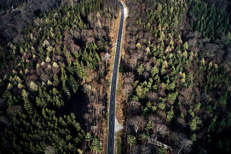 Empty highway cutting through dense forests, aerial view with plenty of copy space available.