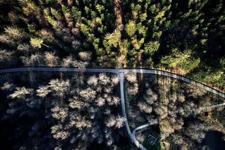 Aerial drone view of trees in autumn. Street crossing the forest with long evening sun shadows. Beautiful top view. Green and Brown tones. Colors germany. Ebnisee