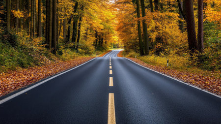A serene autumn road enveloped by colorful foliage, offering a peaceful escape into nature. Ideal for capturing the essence of fall tranquility.
