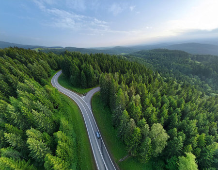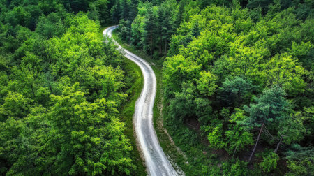 High-resolution aerial image showcasing a winding mountain road nestled amidst a vast, dark green forest. The photo captures a peaceful natural scene, ideal for illustrating outdoor adventures,
