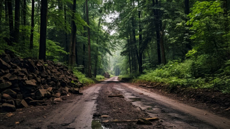 Scenic summer road trip through verdant woodland Creating using generative AI tools