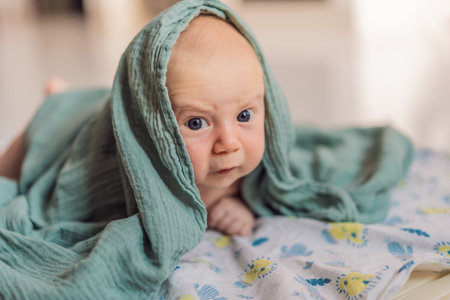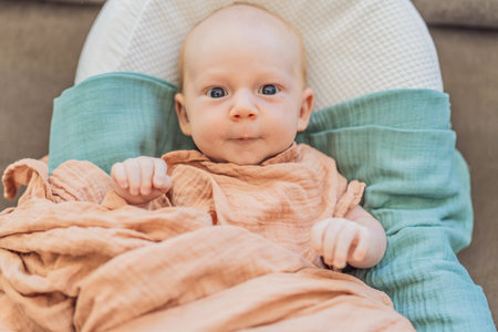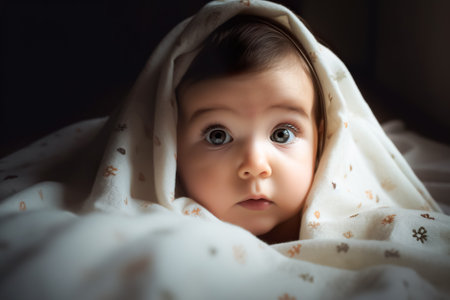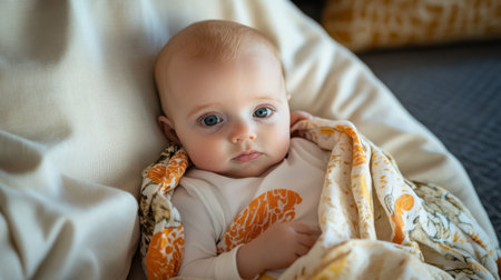 A serene baby wrapped in colorful blanket, gazing thoughtfully