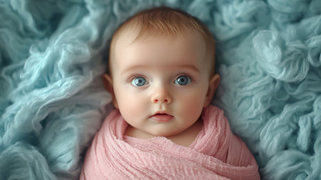 Newborn baby swaddled in a pink blanket, resting on a soft, light blue surface