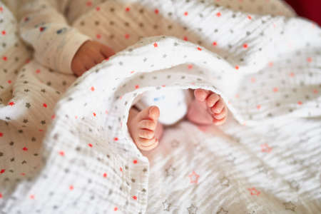 Tiny feet of newborn baby under blanket