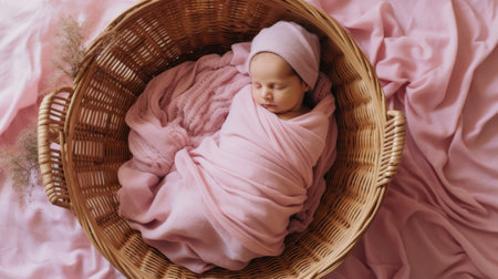 Sleeping newborn baby in a wicker cradle on a pink background top view. Newborn baby concept