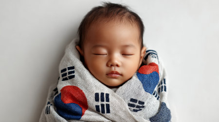 A baby boy rests peacefully wrapped in the South Korean flag against a white backdrop. Soft light highlights his features. This captures innocence and cultural pride.
