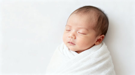A baby with closed eyes rests comfortably, wrapped snugly in soft white swaddling. The serene light background enhances the peaceful atmosphere of this tranquil moment.
