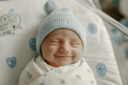 Newborn baby wearing a blue knitted hat, sleeping peacefully in a crib and smiling serenely