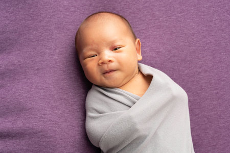 A baby is wrapped in a blanket and has a look of concern on its face. The baby's eyes are closed, and it is looking at the camera. Concept of warmth and comfort
