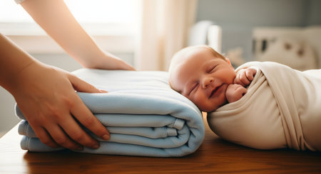 A pair of hands folds a soft blue blanket next to a sleeping newborn baby wrapped in a beige swaddle. The image conveys concepts of care, laundry, and the gentle preparations involved in welcoming a new baby.