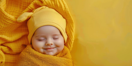 A newborn baby, wrapped in a mustard yellow swaddle and wearing a matching knit hat, sleeps peacefully on a soft grey background. The baby is lying on their back with their arms tucked in and their face turned slightly to the side. The fabric of the swaddle and hat is soft and textured, creating a sense of comfort and security.