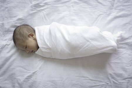 Baby newborn with cloth wrap on the white bed.
