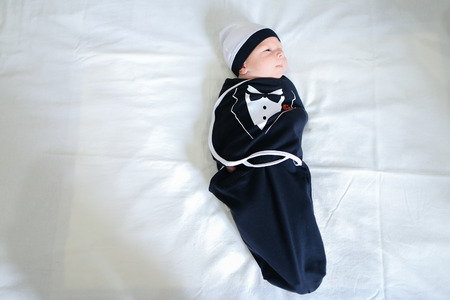 Newborn boy in funny childrens business suit and hat lies on white bed in bedroom. Concept of Maternal Love, Affection, Beginning Life, Cognition Surrounding World.