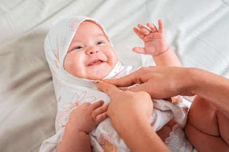 Cute caucasian baby in a white cloth playing on the bed