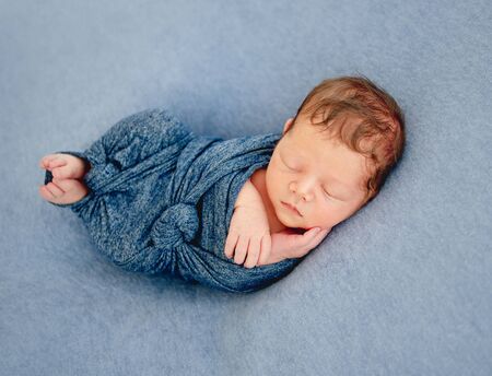 Newborn baby sleeping wrapped in blue blanket