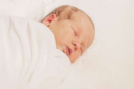 Newborn infant boy sleep on white blanket health care concept