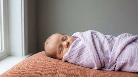 Peaceful newborn baby sleeping by a bright window wrapped in a soft pastel blanket on a cozy textured cushion.