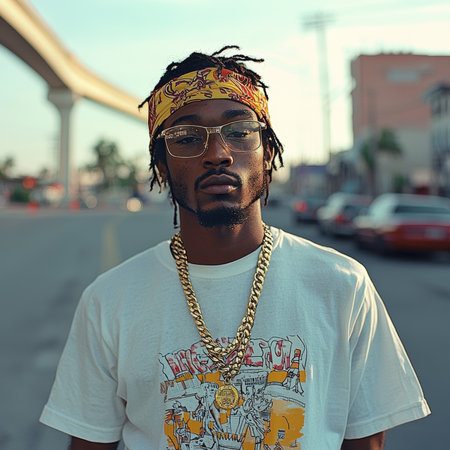 Confident man wearing sunglasses and gold chain posing outdoors in a city environment. Urban fashion and street style represented in a vibrant atmosphere. Perfect representation of individuality and modern culture.