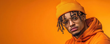 A young man exudes confidence in a vibrant orange hoodie and matching beanie, his streetwise style radiating against a minimalist backdrop The trendy attire and relaxed posture showcase his effortless cool, a testament to the power of simple yet striking streetwear AI Generative