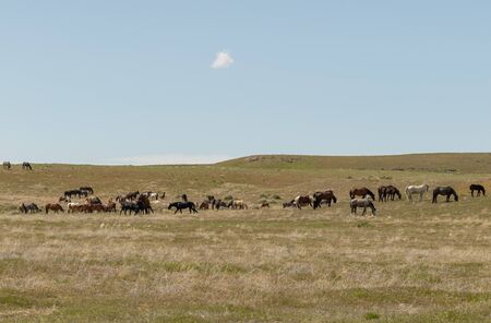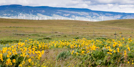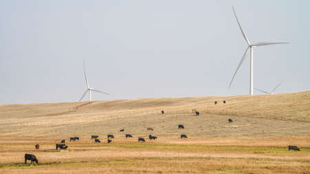 wind turbines and cattle in Wyoming prairie, late summer scenery with haze and smoke from forest wildfire