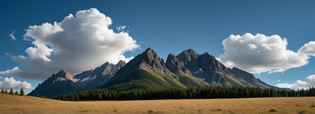 The brilliant sun is shining brightly through the fluffy clouds that are gracefully drifting over the majestic mountains in the distance