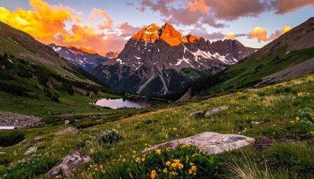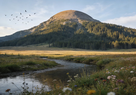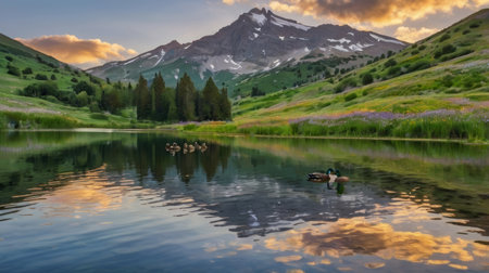A scenic view of a mountain lake at sunset, with a clear reflection in the water, Ducks are swimming on the calm surface. The surrounding landscape features grassy meadows, flowers, and hills with a majestic mountain peak in the background under a cloudy golden sky