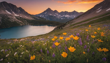 This photograph features a serene mountain landscape with peaks reflected in still water. The scene showcases a range of colors, from the golden hues of the setting sun to the cool tones of the water and sky. The composition offers visual depth and could be suitable for various commercial or editorial uses.