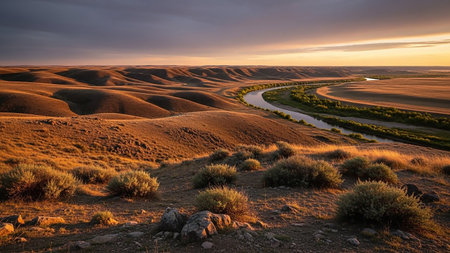 A breathtaking landscape featuring a winding river flowing through rolling, sun-drenched hills. The scene is illuminated by the warm, golden light of sunset, casting long shadows and highlighting the textures of the dry grass and scattered bushes.