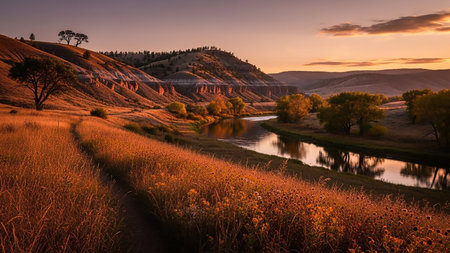 A picturesque landscape bathed in the warm glow of a golden hour sunset. A winding river reflects the vibrant orange and yellow sky. Rolling hills covered in dry autumn grass and scattered trees create a textured foreground and background. A faint path leads through the tall grass.