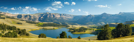The bright sunlight illuminates lush green fields and towering mountains surrounding a peaceful lake, creating a tranquil atmosphere perfect for relaxation and reflection.