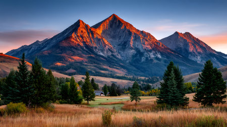 Mountain peaks displaying alpenglow during a sunrise across a serene valley with trees
