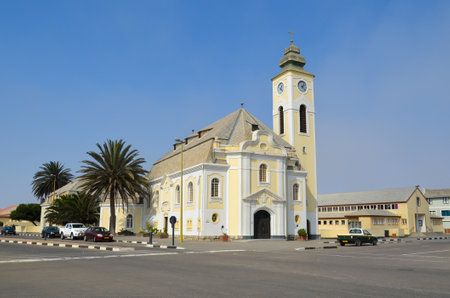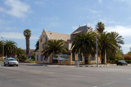 SWAKOPMUND, NAMIBIA - JUNE 30, 2017: A street scene, with historic buildings and the Holy Rosary Roman Catholic Church, in Swakopmund in the Namib Desert on the Atlantic Coast of Namibia